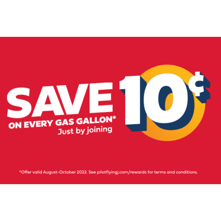 *Offer valid for a limited time from August 1, 2022 at 12:00 a.m. Eastern Time through October 31, 2022 at 11:59 p.m. Eastern Time. Ten cent ($0.10) off per gallon fuel discount. No gallon restrictions; Multiple use. Discount applies to all variations of gasoline as well as auto diesel . Valid only at participating U.S. Pilot or Flying J branded, owned and/or operated locations and One9 locations while supplies last. Not valid at dealer/licensee locations or locations operated under a different brand name. Not valid in Canada. To receive the offer present your myRewards® card, barcode in app, or phone number associated with myRewards® account at time of purchase. Not valid on prior purchases or purchases other than stated above (DEF, propane and commercial diesel are excluded). No cash value, rainchecks, or substitutes allowed. Applicable sales tax applies. Fuel discount may not be combined with other offers, discounts or promotions and cannot be sold or bartered. Other terms, conditions, and restrictions may apply. This discount may be modified or terminated at any time, with or without notice. Availability is subject to federal, state and local law and void where prohibited by law. Data rates may apply. @2022 Pilot Travel Centers LLC.