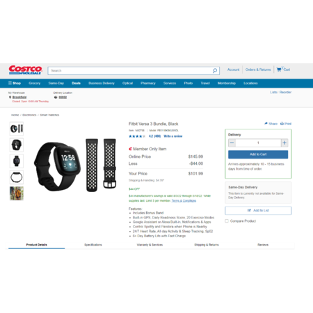 Costco Wholesale has for their Members: Fitbit Versa 3 Bundle (Black) for $101.99. Shipping is $4.99.