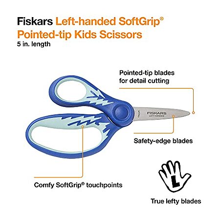 Model: Fiskars 194330 Back to School Supplies, Left Handed Kids Scisors Pointed-tip, 5 Inch, Color Received May Vary