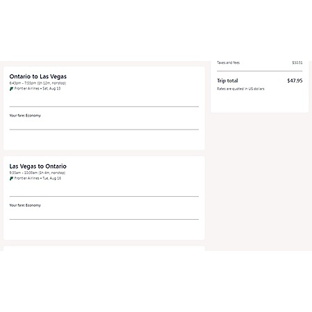 Frontier Airlines, an ultra low-cost 'no frills' air carrier and Expedia have round trip airfares travelling to and from Ontario California (ONT) and Las Vegas (LAS) for $48, nonstop. On Frontier, your low airfare will only take you and a small personal item from point A to point B. There is no seat selection, no carry-on bag and no changes.