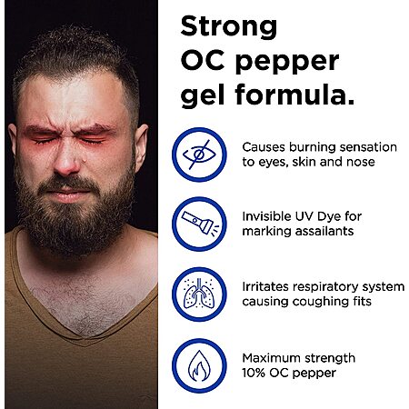 - Provides personal protection by creating a stream of pepper spray gel and UV dye