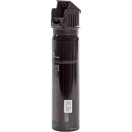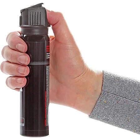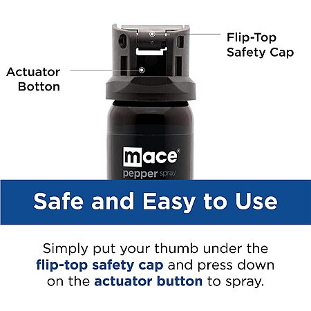 - Flip-top safety cap prevents accidental discharge, pressing revealed actuator button deploys pepper spray