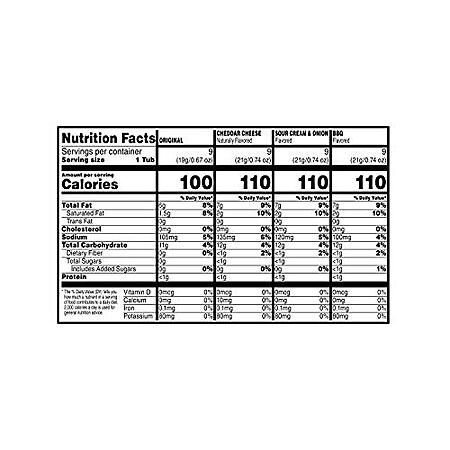 Bulk snack box includes 36, 0.67- or 0.74-ounce cups of ready to eat potato crisps; 9 cups of Original; 9 cups of Sour Cream and Onion; 9 cups of Cheddar Cheese; 9 cups of BBQ; Individual snack packs packaged for freshness and great taste