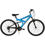 The 26-inch Dynacraft Men's mountain bike is a good choice for any active outdoorsman on the go. It has a sturdy dual-suspension steel frame that provides durability throughout the entire ride. A bold blue metallic paint effect and dual-suspension frame-and-fork combination make this mountain bike stand out in every environment. This 26-inch bike doesn't just look good, it performs well, too.