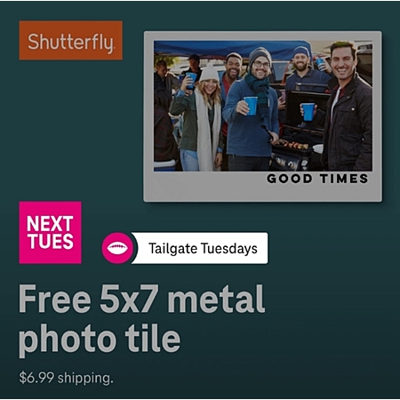 Save in the T‑Mobile Tuesdays app by September 6, 2022, at 4:59 a.m. ET and redeem through shutterfly.com or the Shutterfly app by September 30, 2022, at 11:59 p.m. ET to receive a free 5"x7" metal photo tile plus $6.99 shipping. Not valid on framed photo tiles, canvas photo tile, other products and prior purchases. Offer cannot be combined with other code-based $-off offers. Free product offers cannot be combined with free shipping.