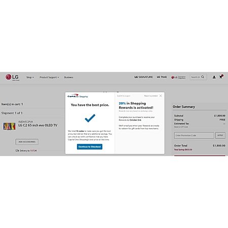 Logged in to my Capital One shopping portal -that showed me the 5% on LG. Opened another window and went to Amazon. With Amazon being the seller with price of $1896.99, I hovered my mouse over the price/prime area and the Capital One banner popped up showing the $379.99 rewards. I clicked on that banner which took me to the Capital One shopping portal. Then, I clicked on the LG option (and took photos just in case) and complete the purchase.