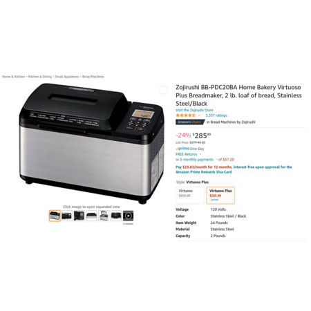 Amazon[amazon.com] has the Zojirushi Virtuoso Plus Bread Machine for $285.99.