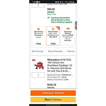 I just ordered this online yesterday but none in stock at my local Home Depot and it wouldn't let me order the drill kit to be Shipped to one store for pick up and then Shipped to a different store for the battery. So I had both the drill kit and the battery shipped to my home. I will return the battery later since I am only interested in the drill kit since it already comes with 2 batteries. The good thing is that the battery will arrive a few days before the drill kit so I will just return the battery the same day it arrives then wait for the drill kit to be delivered and keep it. Good thing I have 4 Home Depots within 15 minutes of me so returns in store are convenient.