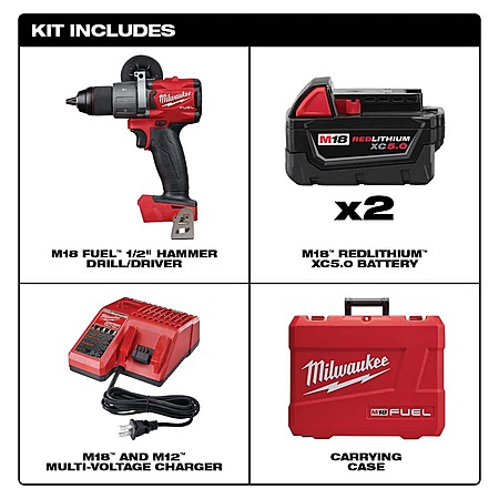 Model: M18 Fuel 18-Volt Lithium-Ion Brushless Cordless 1/2 in. Hammer Drill Driver Kit with Two 5.0 Ah Batteries and Hard Case