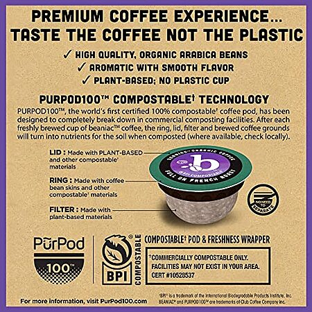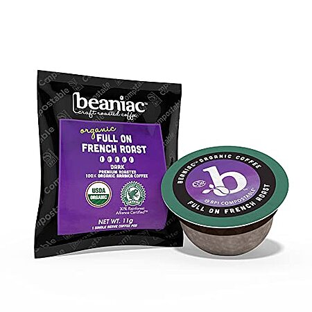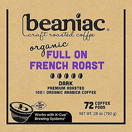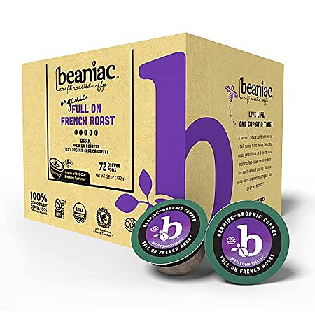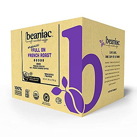 beaniac Organic Full On French Roast, Dark Roast, 72 Compostable Plant-Based Coffee Pods - $25.89 + F/S - Amazon