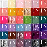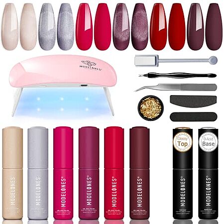 Modelones gel nail polish kit includes colors: gray, red, hot pink, yellow, orange, green, turquoise, baby blue, purple, and silver glitter to name a few. Nails need to be cured under LED nail lamp. Gel Top coat and base coat required. With the included lamp it takes 1-2 min to cure per nail.
