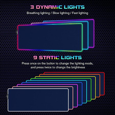 - 12 Lighting Modes: This gaming mouse pad includes 9 kinds of static lighting modes and 3 dynamic lighting modes.