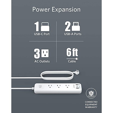 Model: Anker USB C Power Strip with Power Delivery, 3 Outlets and 30W 3 USB (1 USB C, 2 USB A), PowerPort Strip PD 3 with 6ft Long Extension Cord, Flat Plug, for Home, Office, and Dorm Room