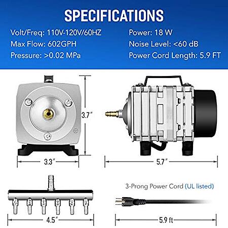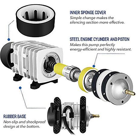 - Best applications: pumping 65 liters of air per minute (17 gallons per minute), low noise (less than 60 decibels) and a 1. 5 m power cord make it an oxygenated aquarium or pond or plant root in a hydroponic system ideal air pump.