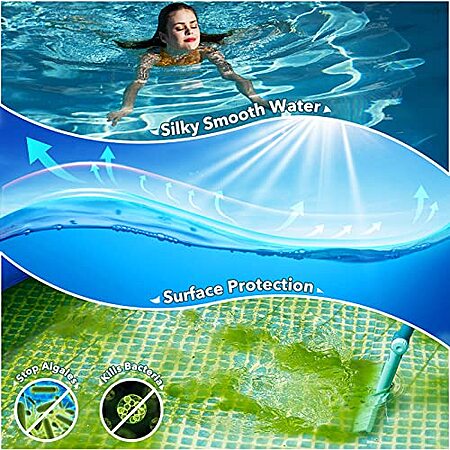 SILKY SMOOTH WATER - Keep your pool water clean and healthy, effectively kills bacterias and algaes; Prevents corrosion, scale and stains; Sun protected to longer chlorine life