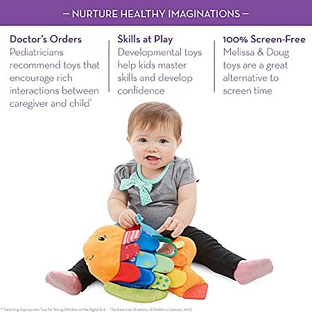 About this Item:- CUDDLY FISH FRIEND: The Melissa & Doug Flip Fish Baby Toy is a squeaking, crinkling, and multi-textured soft toy with bold facial features, bright colors, and hidden pictures located under the scales.