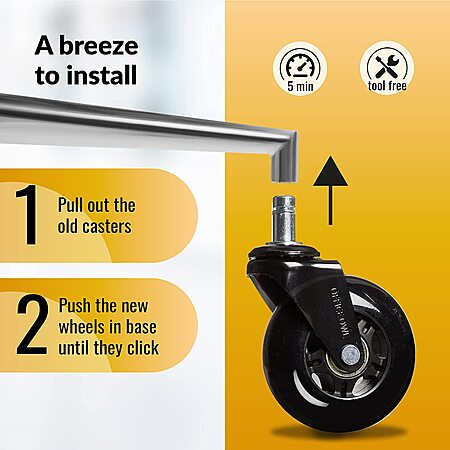 • Nothing but smooth sailing with these desk and gaming chair wheels. The rollerblade-style swivel makes quiet maneuvering a breeze, without any squeaks or creaks.