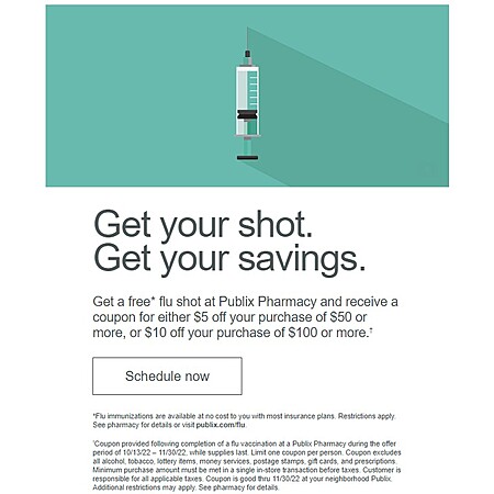 Get a free* flu shot at Publix Pharmacy and receive a coupon for either $5 off your purchase of $50 or more, or $10 off your purchase of $100 or more.†