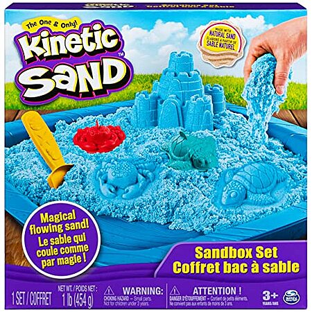 Model: Kinetic Sand, Sandbox Set Kids Toy with 1lb All-Natural Blue and 3 Molds, Sensory Toys for Kids Ages 3 and up