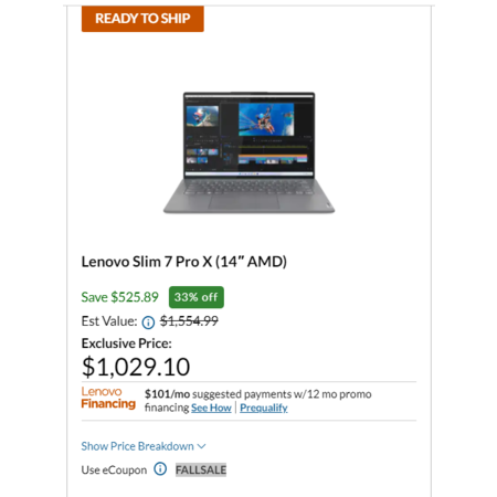 Lenovo has Lenovo Slim 7 Pro X Gaming Laptop (82V20002US) on sale for $1029.1 after coupon FALLSALE Shipping is free.
