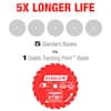 • Tracking point tooth design acts provides straight cuts and control carbide wear for up to 5X longer cutting life versus other blades and 2X the durability in nail-embedded wood