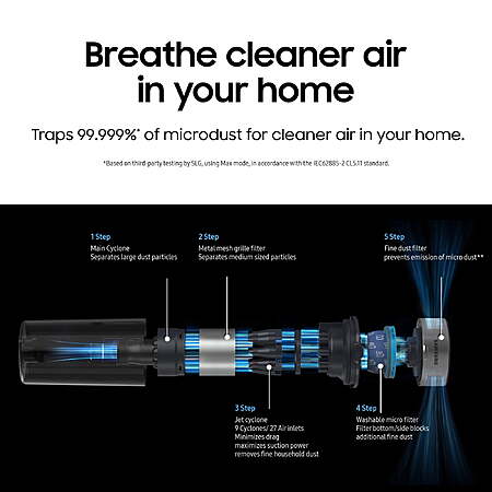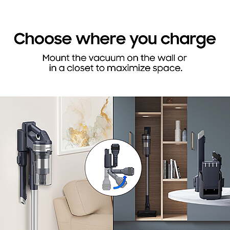 The SAMSUNG Jet 60 Fit Cordless Stick Vacuum features are our most lightweight and maneuverable Jet Stick vacuum coming in at less than 5 lbs. Our powerful Digital Inverter motor, coupled with our Jet Cyclone technology, delivers a consistent 150 Air Watts (est. 55,000Pa) of suction power for excellent cleaning performance on both carpets and hard floors. The Samsung Jet 60 Fit comes with a 21.6V removable battery that lets you vacuum for approximately 40 minutes on a low setting, and can be easily swapped for a spare (sold separately) to extend your cleaning. The Jet 60 Fit is compatible with the Samsung Clean Station for a convenient, hygienic way to empty the dustbin. The second battery is sold separately.