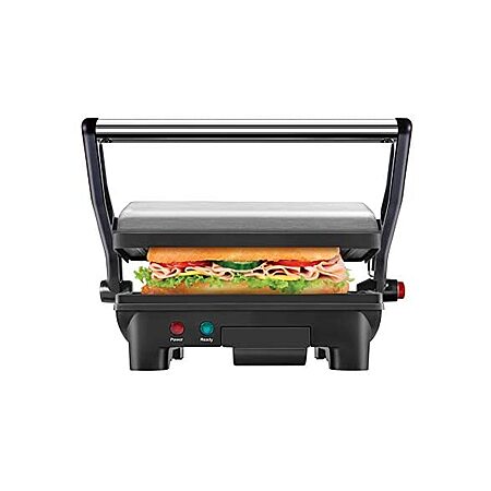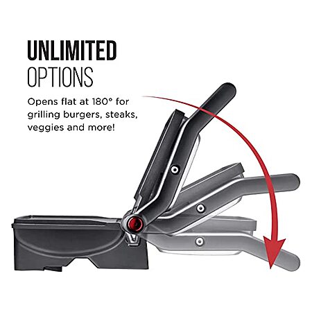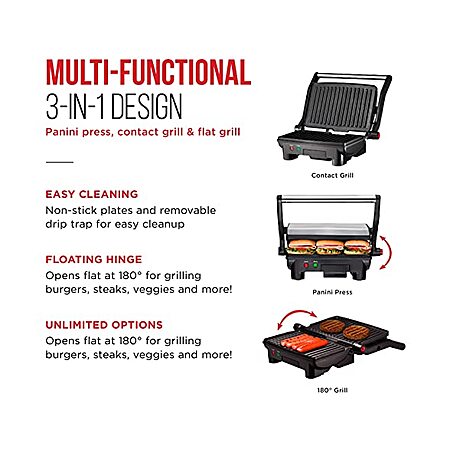 • With just the push of a button, this Grill-Panini Press Combo can be used to press your custom sandwich or open at 180 degrees for grilling burgers, steaks, veggies and anything else you're craving quickly and easily! Use it as a panini press for perfectly crisped bread- no cooking spray required