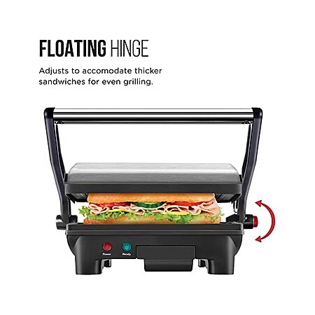 • Floating hinge adjusts to accommodate any size sandwich – thick or thin. Closed cooking surface of 5.5'' x 8.75'' is ideal for two sandwiches, while lay-flat surface of 10'' x 8.75'' can accommodate a variety of food. Great for a quick meal, summer party or a family event