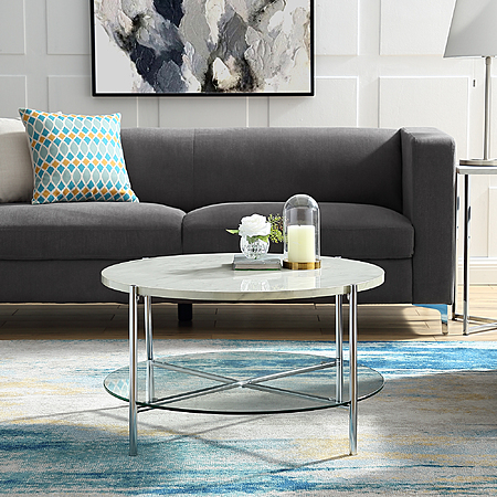 Make a statement in your living room with our coffee table. This round coffee table has a glam, mid-century modern feel that will complement your current home decor. With a mixed material design of a bottom glass shelf, durable laminate tabletop, and round chrome metal legs for an altogether stunning piece. The tabletop is protected in a UV coating for a high shine finish and moisture resistance. Note about wood composite or engineered wood: Often referred to as "MDF," which stand for medium density fiberboard," this type of wood composite is made of compressed wood fibers and has several benefits. These include affordability, consistency, and resistance to warping or rotting over time