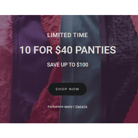Soma offers 10 Panties (Various) for $15 when you add 10 pair of the 10 for $40 (priced $14 each) to cart (subtotal $125+) and apply promo code 41574 in cart. Select free store pick up where stock permits otherwise shipping is free.