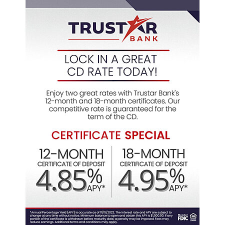 Trustar Bank offers 4.85% APY on 12-Month CD with a minimum $1,000 Deposit.
