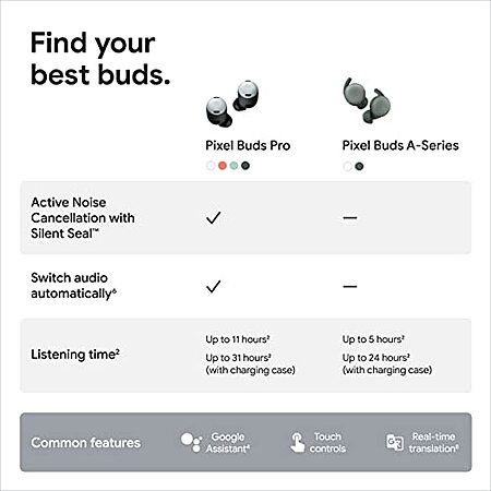 • Pixel Buds Pro use Active Noise Cancellation with Silent Seal to adapt to your ear and help block outside sounds, creating a quiet foundation so your music can shine