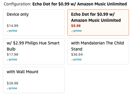Amazon has a bundle for $9.98 and it includes the 3rd generation Dot for 99 cents plus Amazon Music Unlimited for 8.99. This is $5 less than the $14.99 standalone Dot price. Just be sure to cancel Amazon Music within 30 days!