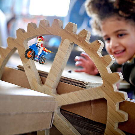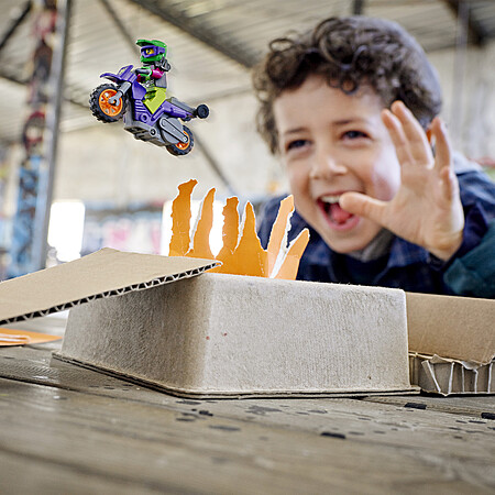 - Kids push the stunt bikes to activate the flywheels, then unleash them for amazing jumps and airborne maneuvers with characters Raze, Wallop, and Rocket Racer from LEGO City Adventures TV series