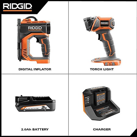 Rigid 18V Cordless High Pressure Inflator Kit with 2.0 Ah Battery, Charger, and Torch Light $99