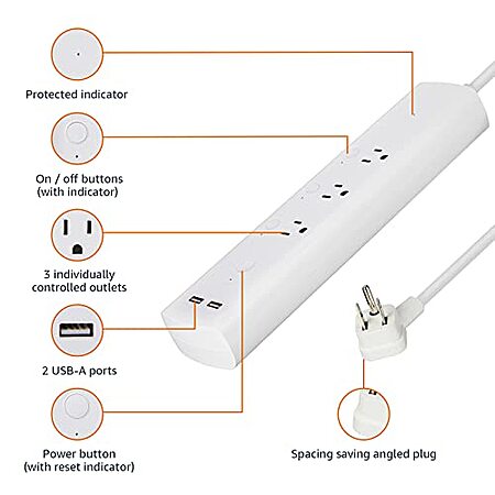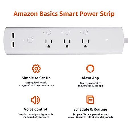 Model: Amazon Basics Smart Plug Power Strip, Surge Protector with 3 Individually Controlled Outlets and 2 USB Ports, 2.4 GHz Wi-Fi, Works with Alexa