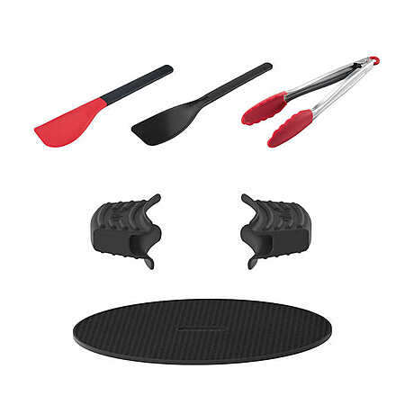 Everything you need: silicone protective pad, silicone handle covers, silicone spatula spoon, nylon turner and 12" silicone-coated tongs