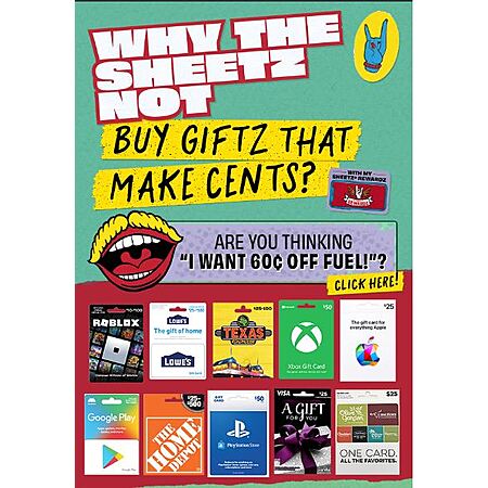 Fuel discount is a one time use with a limit of 25 gallons. Fuel discount can be stacked and are valid for 10-days. Price per gallon can be reduced to as little as 2¢ per gallon. Everyday special is 20¢, with an additional 40¢ fuel discount to your MySheetz Rewardz account. Subject to availability. See gift cards for details, terms, conditions and (if applicable) fees. Gift cards shown are not sponsors or co-sponsors of this promotion. All trademarks are property of their respective owners. Restrictions apply. Limit 1 fuel discount per card type/UPC per month. Member purchase of any gift card with a minimum $25 value. Vanilla® Visa® Gift Cards are issued by TBBK Card Services, Inc., Pathward, N.A. or Sutton Bank, pursuant to a license from Visa U.S.A. Inc. Pathward, N.A. and Sutton Bank, Members FDIC. See back of the gift card to identify its issuer. Gift cards may be used in the U.S. and District of Columbia everywhere Visa debit cards are accepted but have no ATM or cash access; other terms and conditions apply – see Cardholder Agreement for details. Issuers do not endorse or sponsor and are not affiliated in any way with this offer. Vanilla Visa Gift Cards are distributed and serviced by InComm Financial Services, Inc., which is licensed as a Money Transmitter by the New York State Department of Financial Services. NMLS ID # 912772. All trademarks are property of their respective owners. © Copyright 2022 InComm Payments™. All Rights Reserved. Google Play and the Google Play logo are trademarks of Google LLC.