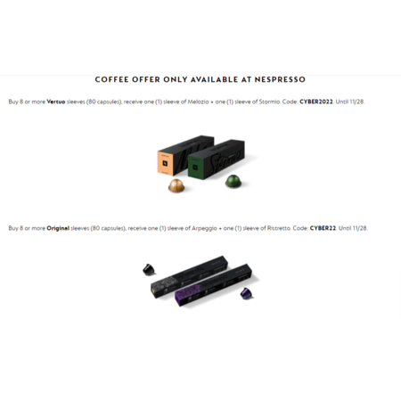 Buy 8 or more Vertuo sleeves (80 capsules), receive one (1) sleeve of Melozio + one (1) sleeve of Stormio. Code: CYBER2022. Until 11/28.