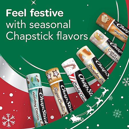 - Lip balm advent calendar features Christmas ChapStick flavors: Candy Cane, Sugar Cookie, Pumpkin Pie, Holiday Cocoa, Vanilla Latte, Clover Honey, Vanilla Mint, Cake Batter, Cotton Candy, Passion Fruit, Classic Cherry and Classic Original