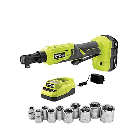 Ryobi ONE+ 18V Cordless 3/8" 4-Position Ratchet Kit & 10-Piece SAE Socket Set w/ 2.0 Ah Battery & Charger (P344KSB) for