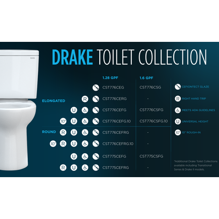 COMPLETE YOUR TOILET - Finish your purchase with the addition of a TOTO SoftClose seat or upgrade to a WASHLET bidet seat. Drake tank and bowl with hardware included. Purchased Separately: Wax ring, flange bolts, and water supply lines.