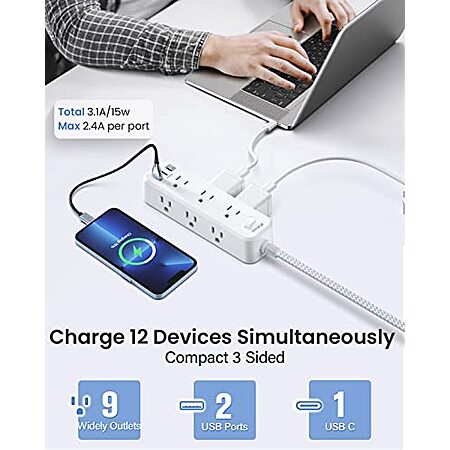 Mifaso 9-Outlet Power Strip / Surge Protector w/ 3 USB Ports (1x USB-C)
