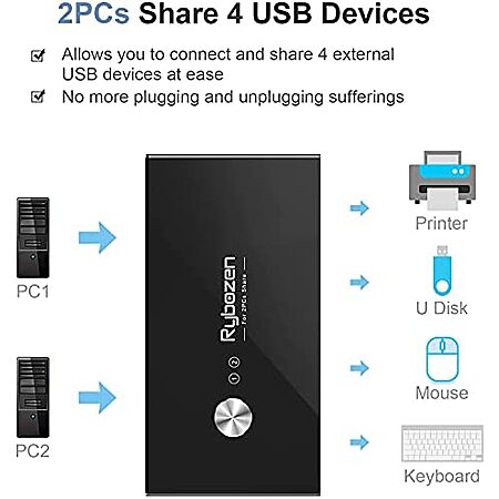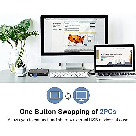 • Switcher for 2 PC Sharing 4 USB Devices, One-Button Swapping for Keyboard, Mouse, Scanner, Printer, Computer