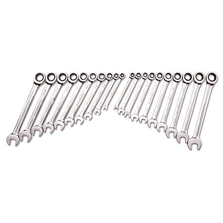 20 piece ratcheting combination wrench set with SAE and metric sizes.