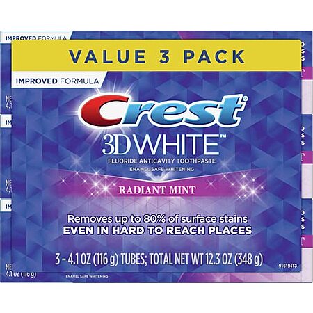 Amazon has 3-Pack 3.8-oz. Crest 3D White Toothpaste (Radiant Mint) on sale for $12.97 - $3.84 when you 'clip' the coupon on the product page - 5% when you checkout via Subscribe & Save = $8.48. Shipping is free with Prime or on $25+ orders.