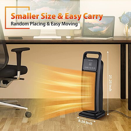 [Convenient to Use & Compact] With the size of 21 1/4" L & 8 1/4" W, this space heater for indoor use is compact and can be put anywhere, even on your office desk. You can remotely control this portable heater (within the 16ft range). Meanwhile, this portable heater for indoor use provides you with storage space for the remote control, so you can say goodbye to fishing around the remote control. At 4lbs weight, this small oscillating heater is super portable and is easy to move with a handle
