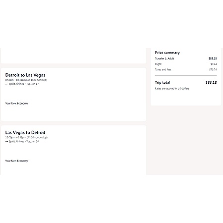 Spirit Airlines, an ultra low 'bare fare' air carrier and Expedia have round trip airfares travelling to and from Detroit (DTW) and Las Vegas (LAS) for $84, nonstop. On Spirit Airlines, your low airfare will only take you and a small personal item from point A to point B. There is no carry-on bag, no seat selection and no change.