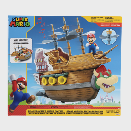 The Deluxe Bowser's Airship is a propeller driven fortress created to bring your Super Mario playset dreams to life. Equipped with cannons, rotating propeller masts, wheels, and authentic in-game sounds, the Airship includes a two and a half inch Mario figure poised for victory. Roll the airship to activate spinning propellers and open the ship to store all your figures! Press the button to activate in-game sound effects. Mario must conquer the Airship to stop the invasion of the Mushroom Kingdom. It's up to you, Mario and his friends to defeat Bowser. This playset works with most two and a half inch figures. 2 x AAA batteries required (not included). Suggested for kids age 3 or older.