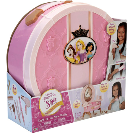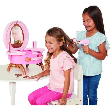Includes: 1 Vanity, 1 Play Flat Iron, 1 Play Curling Iron, 1 Play Hair Dryer, 1 Curling Brush, 1 Hair Comb, 1 Pair of Play Scissors and 2 Hair Clips
